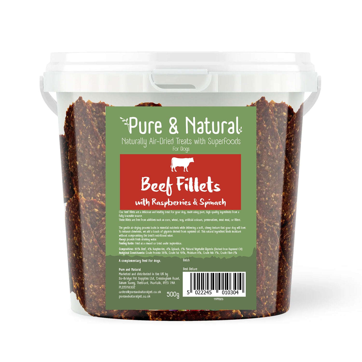 Nutrient-dense beef fillets air-dried to preserve raw nutrition. Made with 90% beef, iron-boosting spinach, and raspberries for: