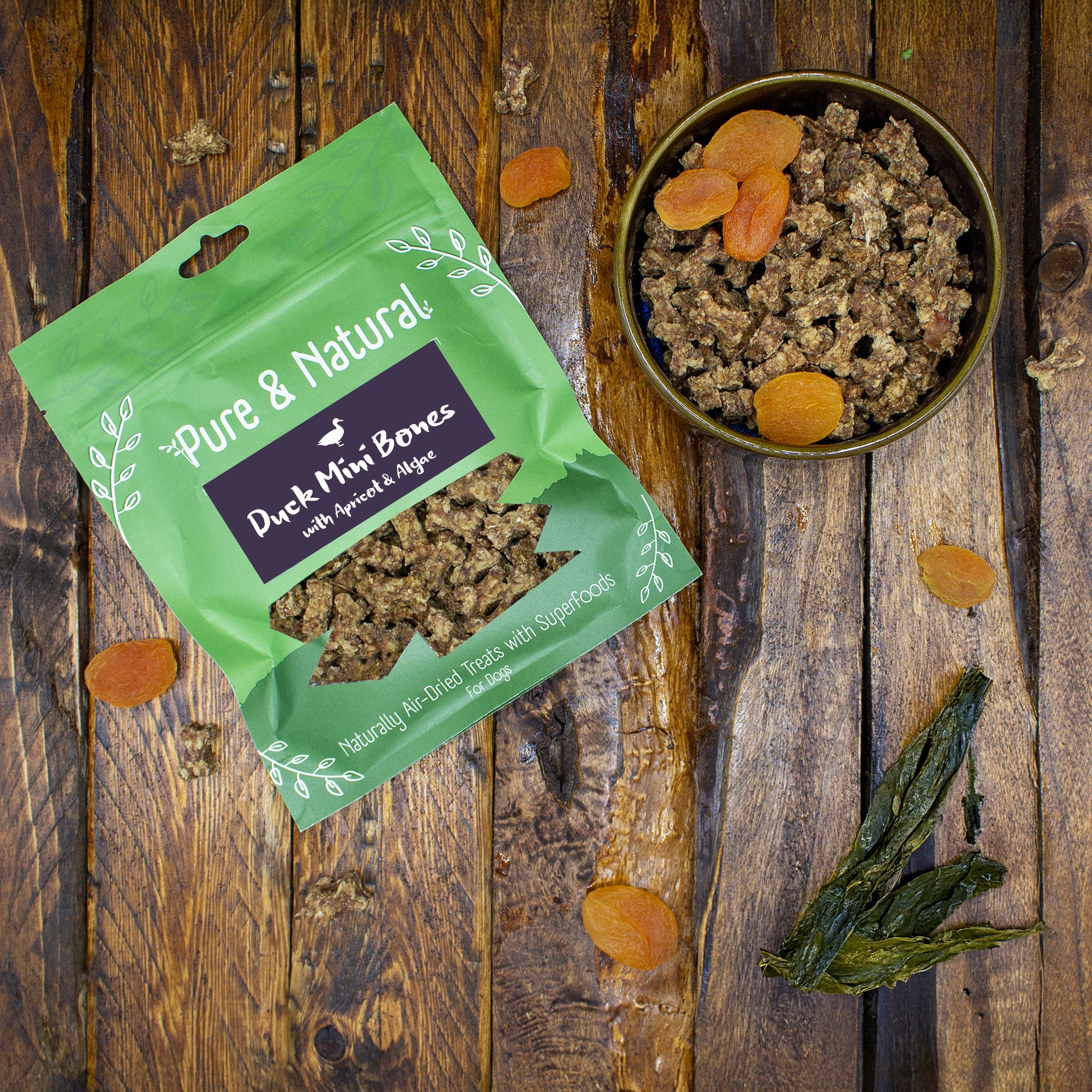 Gentle, single-protein duck mini bones slowly air-dried to preserve natural nutrients and rich taste. Made with 90% duck, apricot, and nutrient-dense algae, these treats deliver: